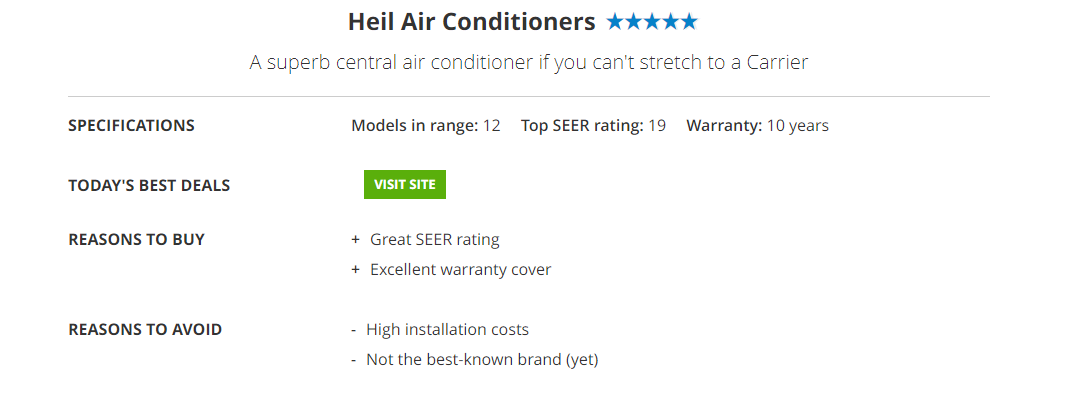 If you want peace of mind when buying a central air conditioning unit, we’d recommended Heil. That’s because the company offers up to a 10-year parts warranty, with some AC units also coming with an extended 10-year no-hassle full-unit replacement. That covers failure of the compressor, coil or heat exchanger. If either of those should fail, Heil will replace the entire unit, terms permitting.
