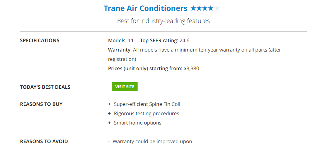 Since 2015 Trane has succeeded in being named ‘America’s Most Trusted HVAC System’ every year by Lifestory research, thanks to its dedication to delivering quality products. This commitment to excellence is obvious with its testing regime and an insistence on trained engineers installing and servicing its products for warranties to be valid. Aside from its accolades, another major factor that might sway you to pick Trane for your central air conditioning unit is the standout features on offer. Within certain models, the Spine Fin Coil goes a long way to aid with efficiency, as it allows for faster cooling. It’s also made with all aluminum which makes it more resistant to corrosion than copper alternatives. There’s also the chance to optimize your central air conditioning unit with certain Trane models, as some have thermostats that can be linked to smartphones thanks to Wi-Fi connection. That allows for ultimate control over your home’s temperature, as well as the chance to pair it with other smart devices, such as your smart speaker. Trane is certainly a reliable brand, and its range of prices is another good reason to take a look at what they have to offer. The warranties are all at least ten years from the date of purchase, though that does depend on registering your unit and keeping it serviced with Trane-certified dealers.