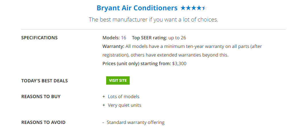 You’ll have plenty of choice if you decide that Bryant is the one for you, with 16 models to choose from, with a variation of SEER ratings and prices attached to them. No matter which one you opt for, Bryant air conditioners should deliver a coolness to your home to help you survive the summer. It’s important to note that Bryant comes under the ownership of United Technologies, meaning it won’t be surprising to find very similar products from competitors such as Carrier in their range. However, Bryant does tend to be a little more affordable than their counterparts and you’ll benefit from the fact that the installation process is standard across brands. There are affordable choices when it comes to Bryant’s thermostats too, with the option of a full-color touch screen display to accompany your unit for not too hefty a price. Or, if you want something a step above, then there are also Wi-Fi-enabled alternatives offering multi-zone control.Bryant is an all-around good choice if you want to shop around before you make your final decision, and don’t fall down when it comes to warranty either, with a standard ten-year guarantee (given that you register within the specified time period).