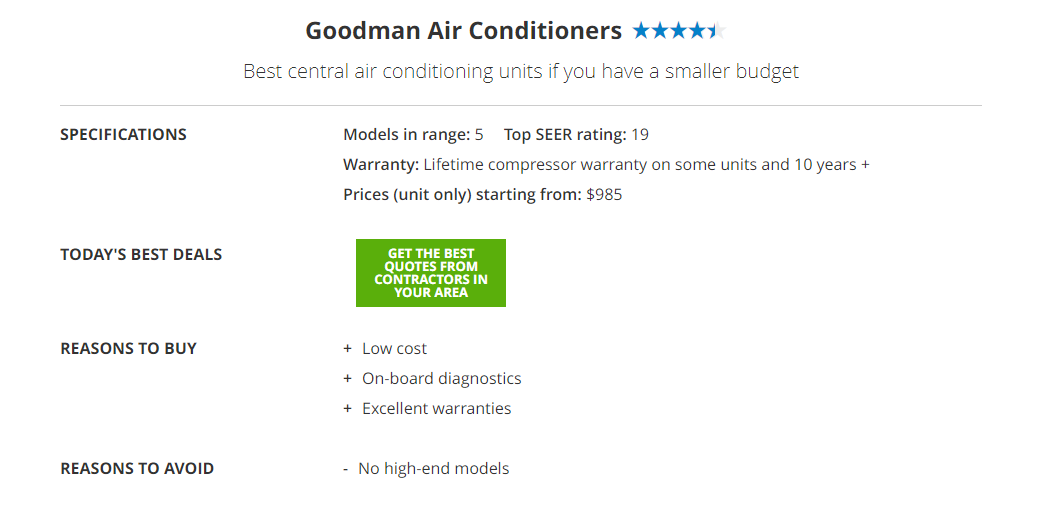 For a budget-friendly yet efficient central air conditioner, Goodman is the best brand. Offering five central air conditioning models, prices for a unit alone can start from as little as $985, although installation costs are not significantly cheaper than elsewhere. Despite its low costs, the company does not compromise on quality, and units are equipped with several handy features. An example would be the convenient onboard diagnostics that help with the maintenance and upkeep of the units.Users can store up to six fault codes which will notify them in the event of a developing problem. Goodman air conditioners are also quiet, ranging from 40 decibels normally, up to 70 decibels at the most.While you could find more energy-efficient brands on the market, you are still likely to make an overall saving. A real saving grace is Goodman’s excellent warranty coverage. They offer a 12-year compressor warranty on most models and 10-year warranty on others, which is better than many competitors. Reliable and efficient, Goodman air conditioners are ideal for those living in hotter environments who require comfort and value for money.